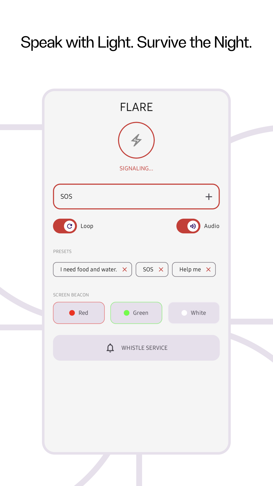 Offline survival tool. Text-to-Morse flashlight, screen strobe, and SOS whistle.
